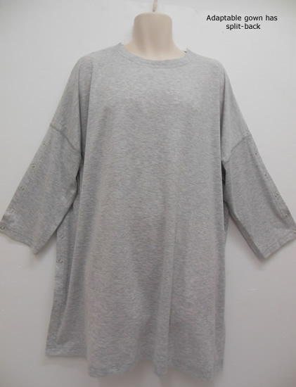 The gown can be opened along the perimeter seams, allowing localised access for physiotherapy, changing bandages, attending to catheters, etcetera, without the need to completely disrobe the patient. The gown has a split-back which is fully lapped for modesty. # Metal closures may be changed for plastic closures or hook and loop tape if required. (The type of closures determine the cost of the garment) UNISEX style Grey Marle colour Made from poly cotton interlock. Gentle-wash instruction apply to extend the life of the garment.